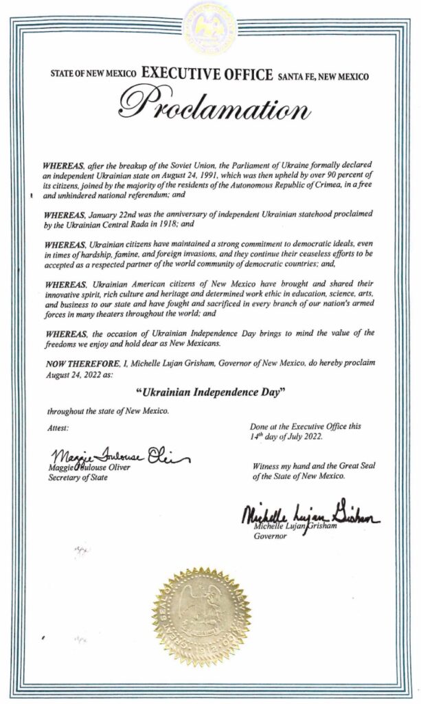Governor Michelle Lujan Grisham has signed a proclamation declaring August 24, 2025, as Ukrainian Independence Day in the State of New Mexico.