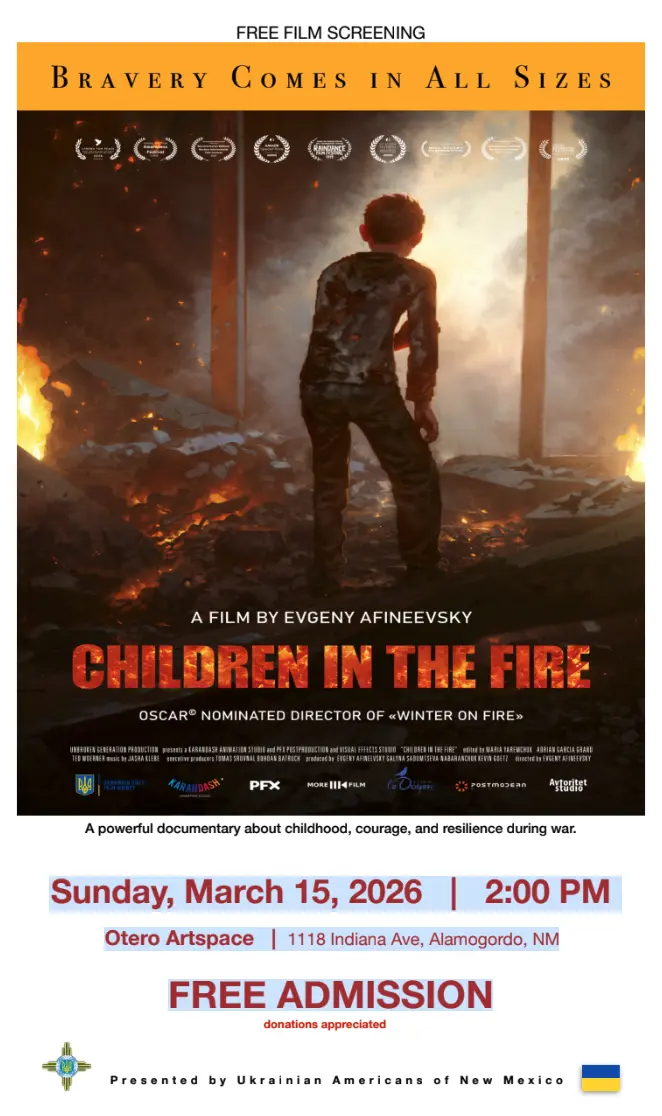 Join us in Alamogordo for a special screening of this powerful documentary about Ukrainian children whose lives were changed by war. The film combines real footage and animation to tell the stories of young survivors who continue pursuing their dreams despite the invasion.