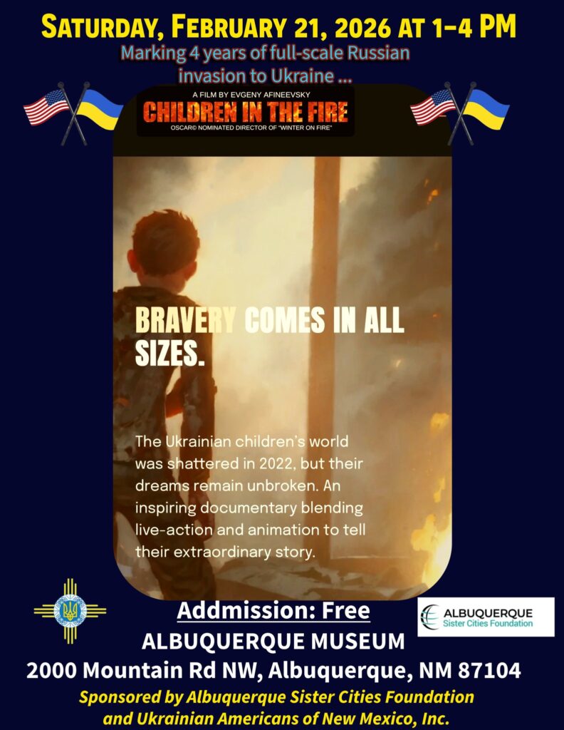 This FREE event sponsored by Albuquerque Sister Cities Foundation and Ukrainian Americans of New Mexico marks 4 years since the full-scale Russian invasion of Ukraine — a solemn anniversary honoring the resilience, courage, and unbreakable spirit of the Ukrainian people.